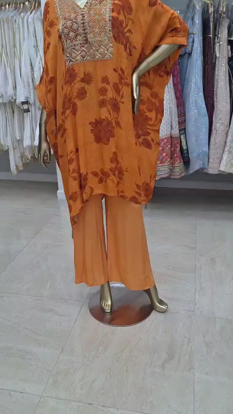 Bring sunshine to your wardrobe with this breezy amber orange kaftan, detailed with rustic floral prints and intricate embroidery. Light, airy, and effortlessly stylish — perfect for sunny days and easygoing gatherings!
