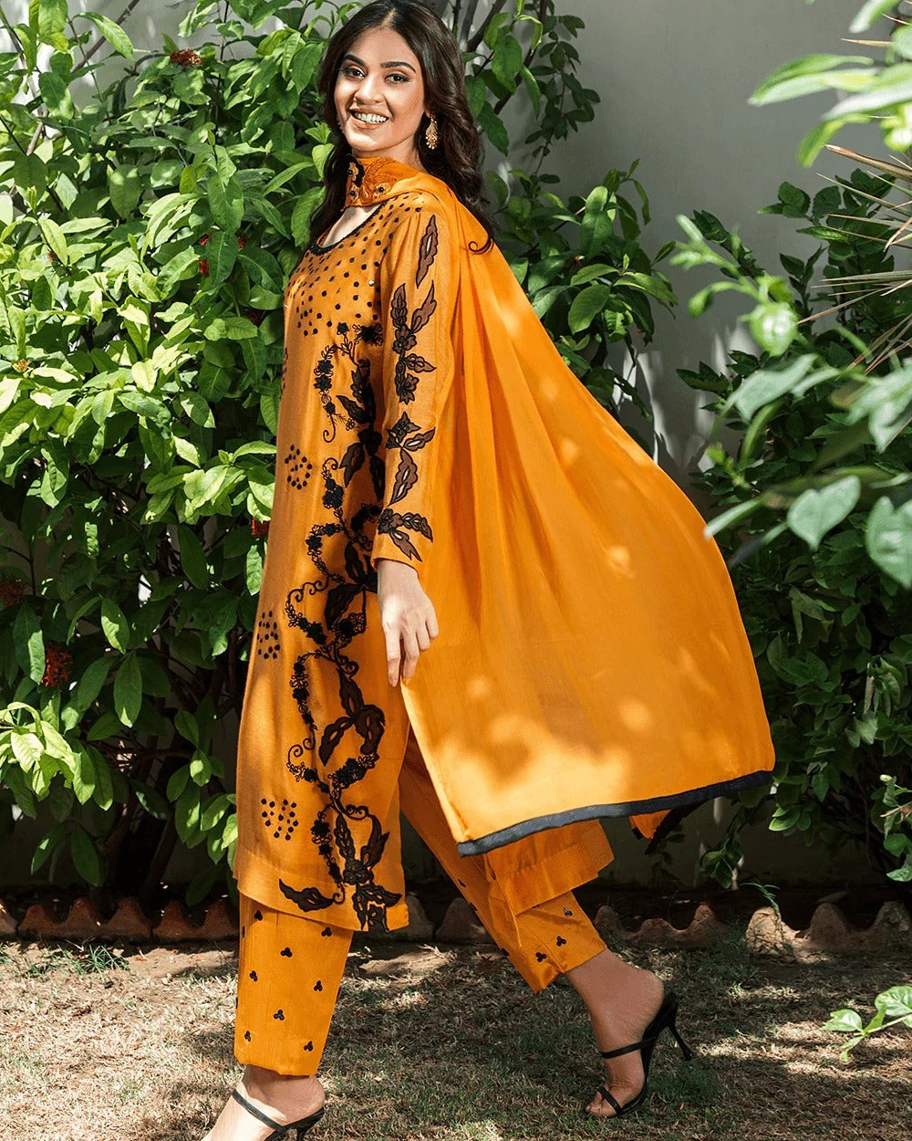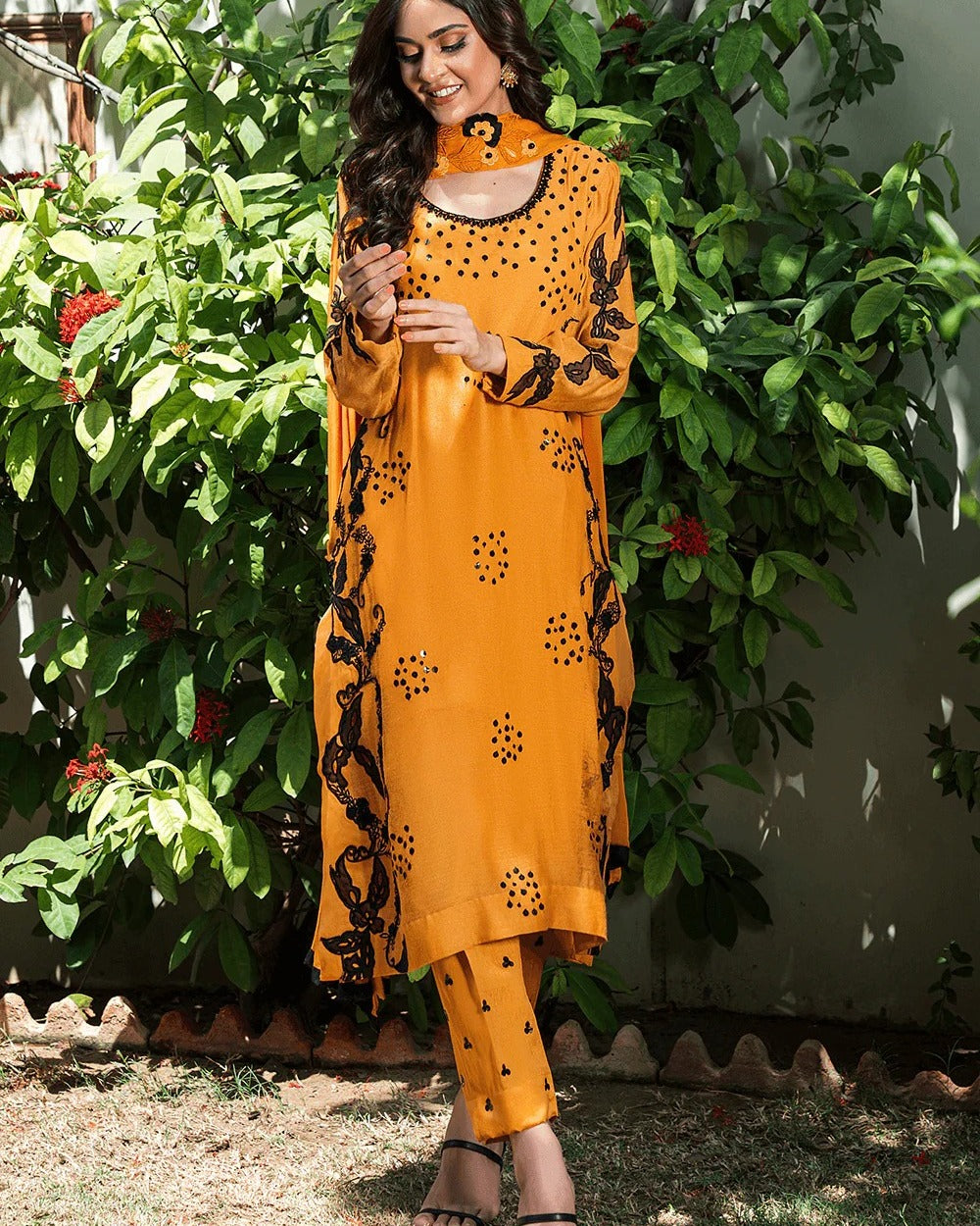 This mustard yellow outfit is pure sunshine with a bold twist! The black embroidery adds drama, while the cheerful tone keeps it playful and fresh β€” perfect for a daytime celebration or festive gathering. πŸŒΌπŸ–€