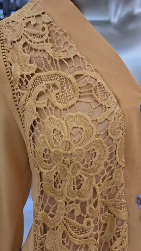 Step into sunshine with elegance. This mustard yellow outfit is a perfect mix of bold color and delicate artistry. Featuring intricate lace embroidery in the front, detailed sleeve accents, and graceful white motifs on the sides — it’s a true statement piece.