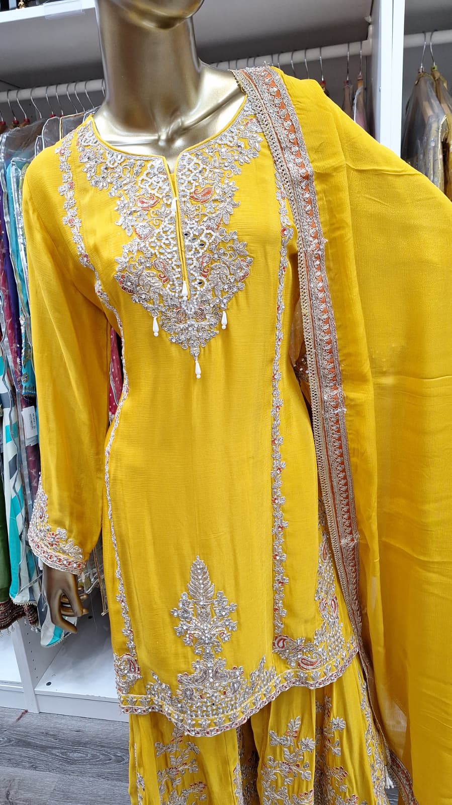 Brighten up any celebration in this radiant yellow sharara set, delicately adorned with silver embroidery and timeless charm. Let your outfit speak before you do—this mustard masterpiece is elegance, joy, and celebration all in one.
