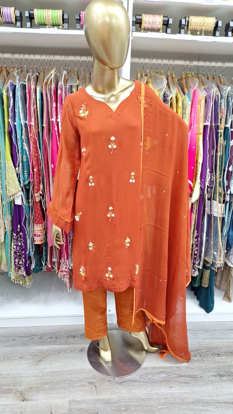 A warm, earthy hue paired with intricate detailing makes this outfit ideal for both daytime chic and evening grace.