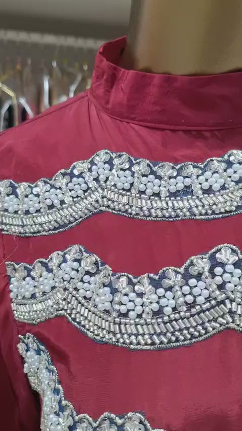 Wrapped in the richness of maroon and kissed by the freshness of teal, this outfit is a celebration of timeless grace and modern charm. Perfect for moments that call for both elegance and festivity.