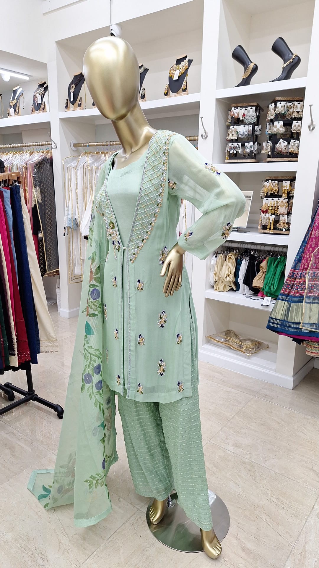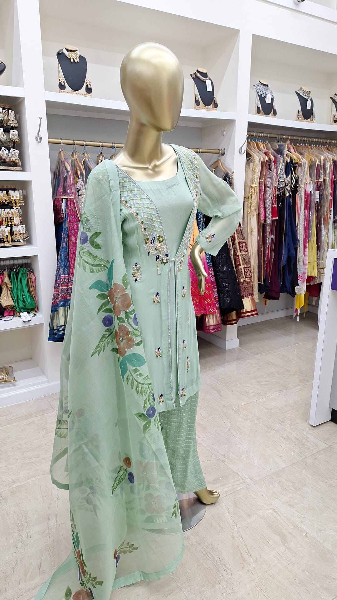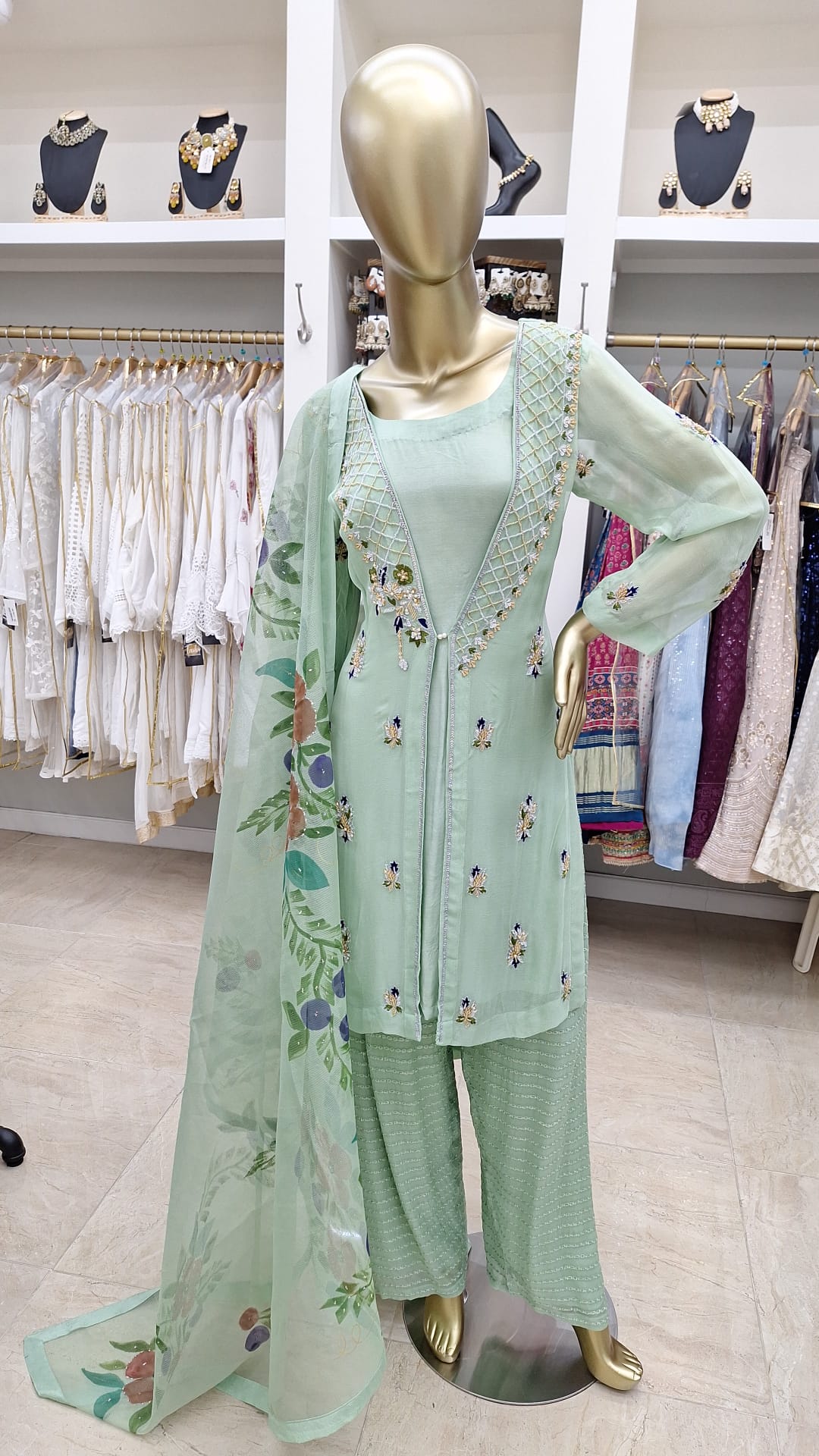 Step into refreshing elegance with this mint green suit, adorned with delicate embroidery and paired with a soft floral-printed dupatta. Light, graceful, and perfect for daytime festivities or Eid brunches.
