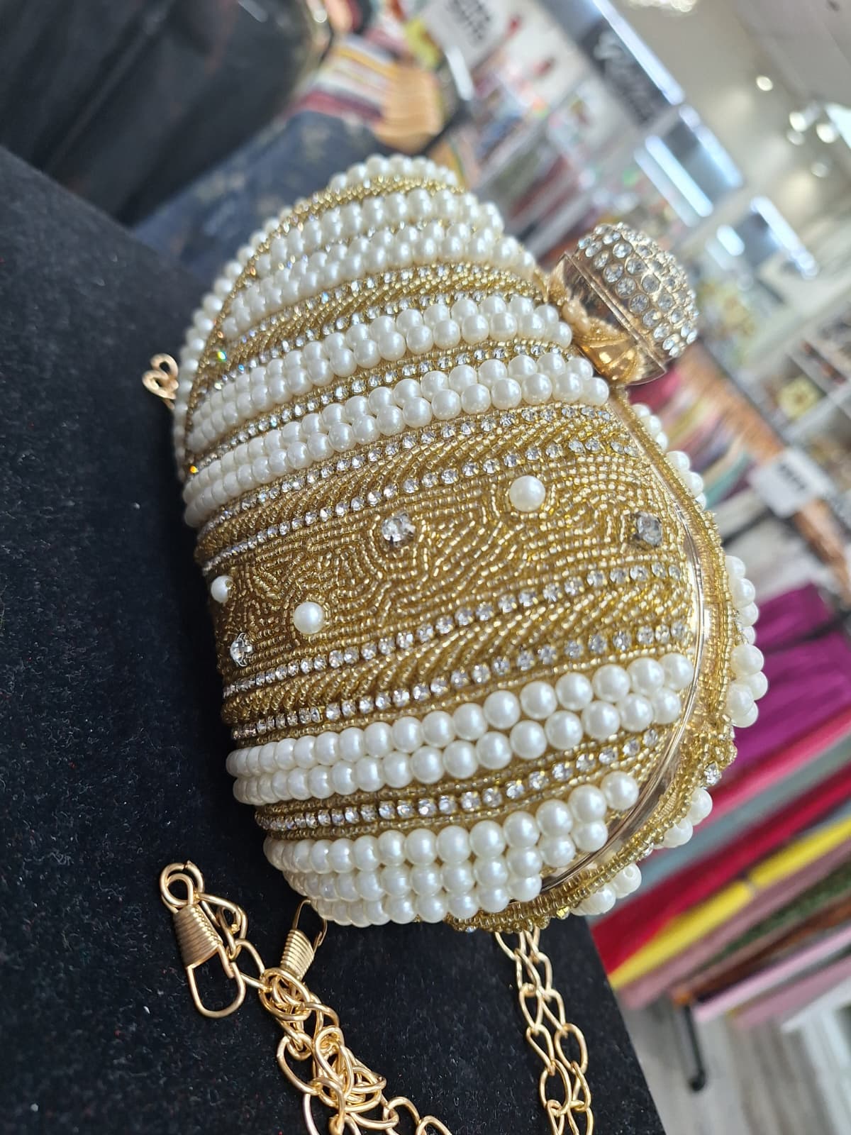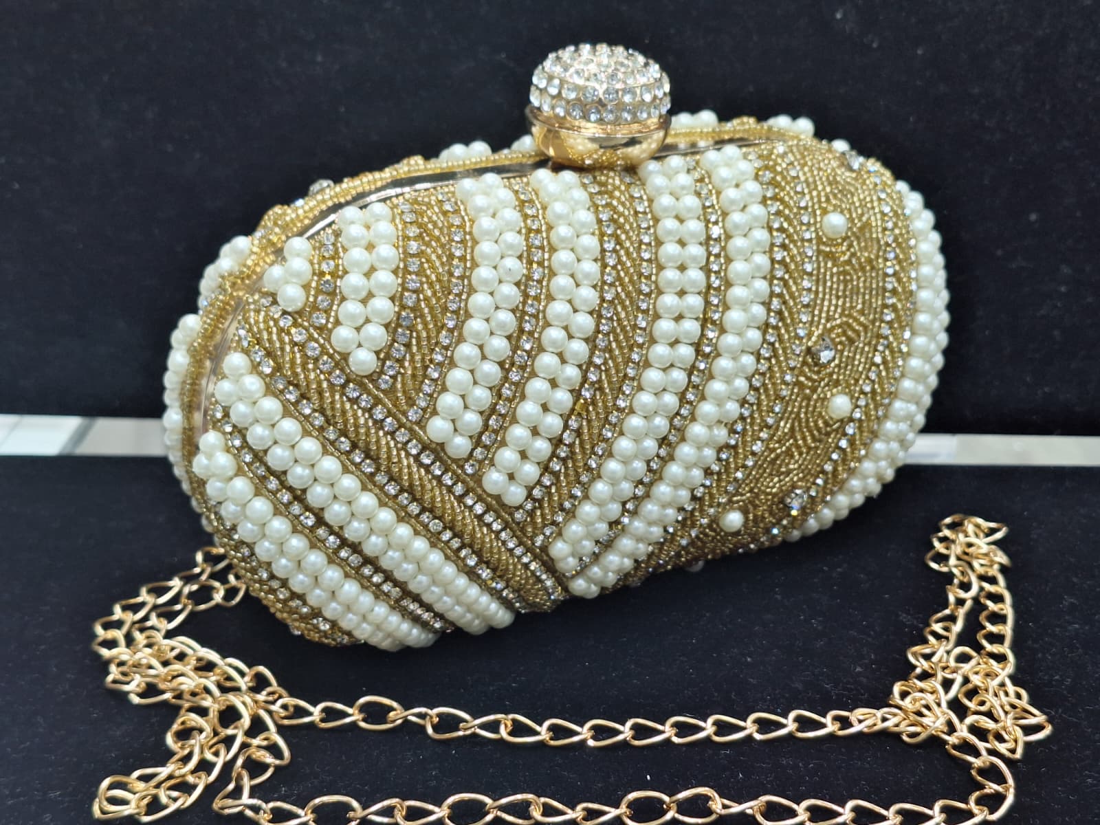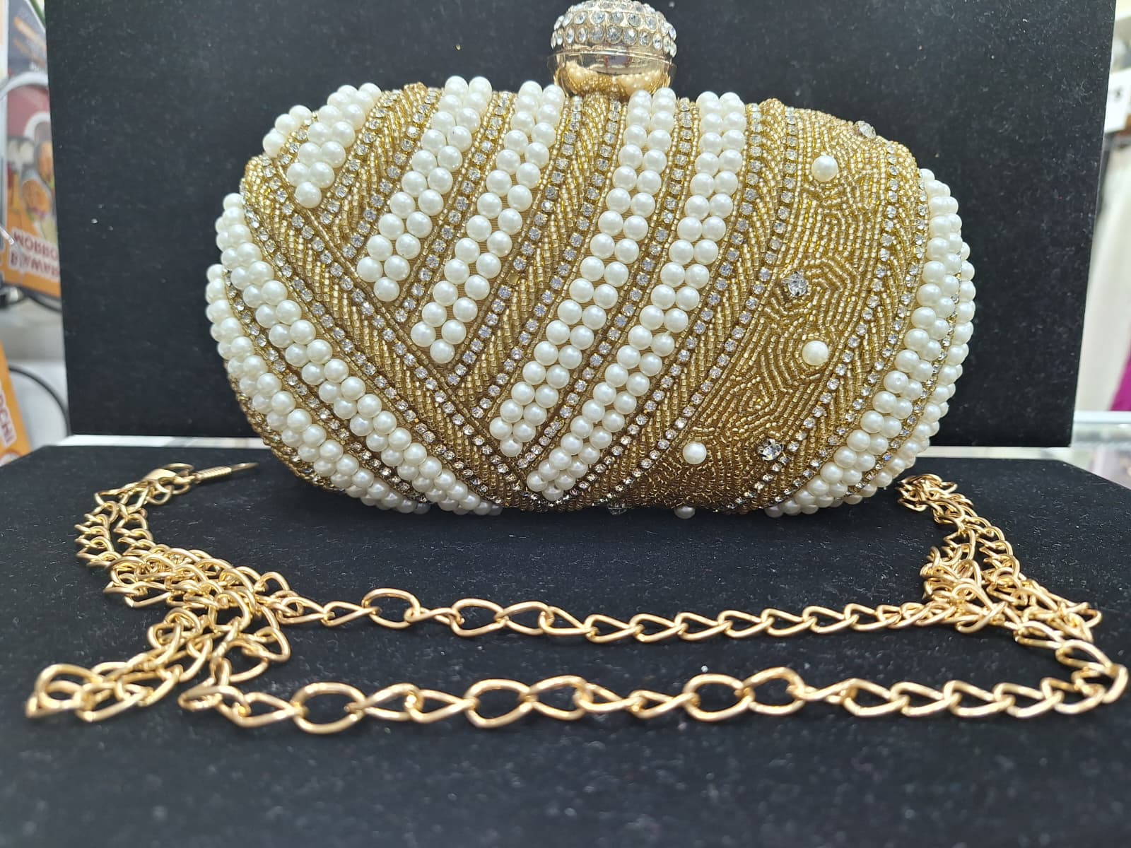 #PearlElegance #GoldenGlow #LuxuryClutch #EveningGlam #TimelessStyle #RegalRadiance #BeadedBeauty #CoutureAccessories