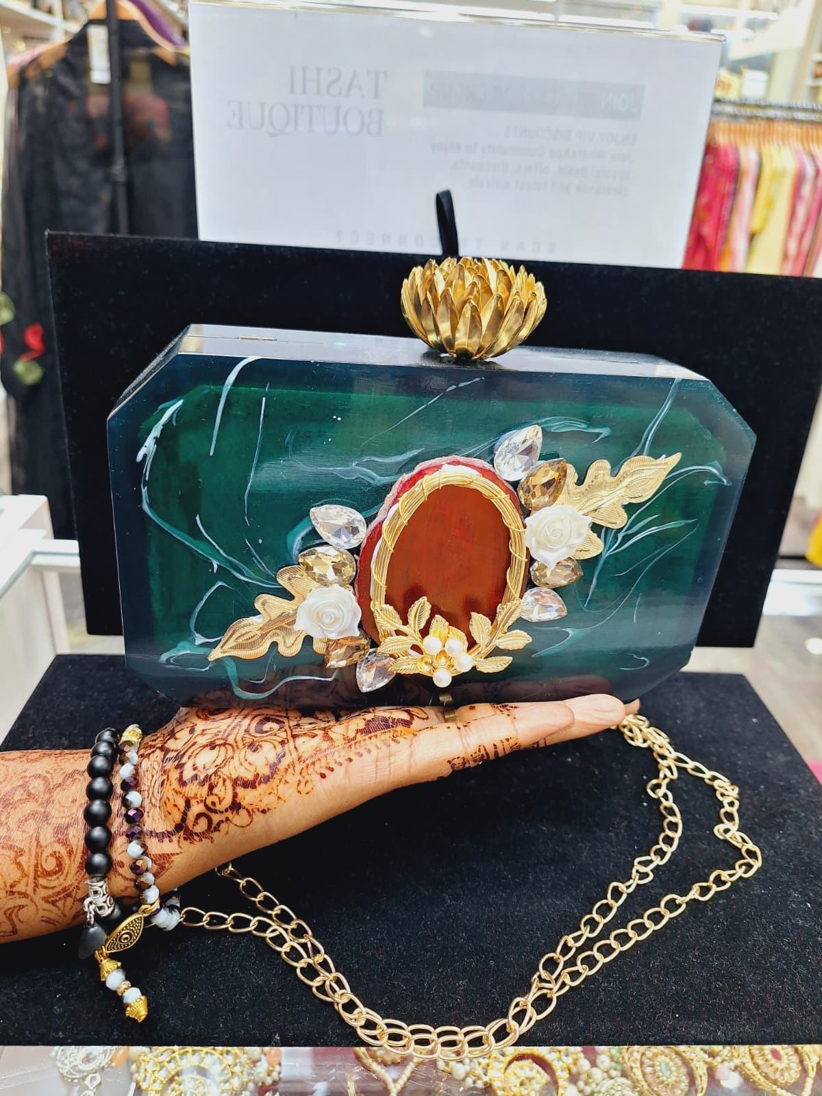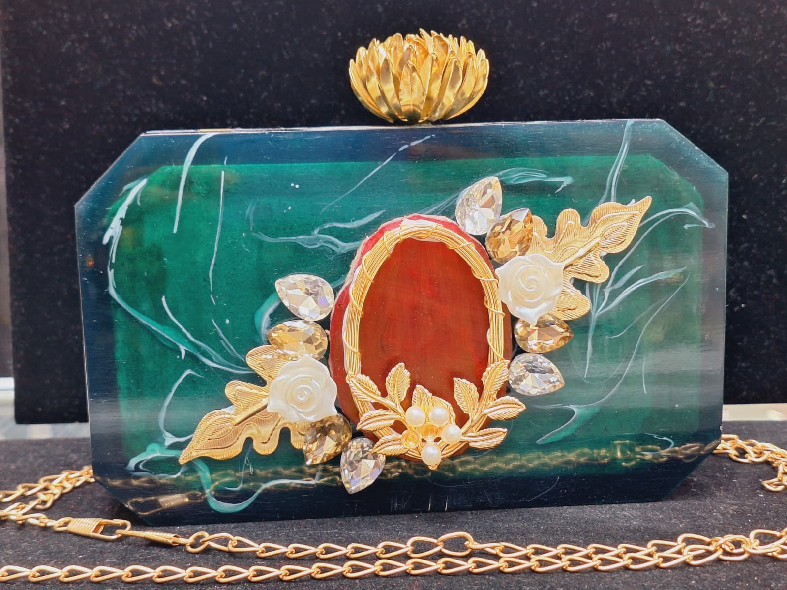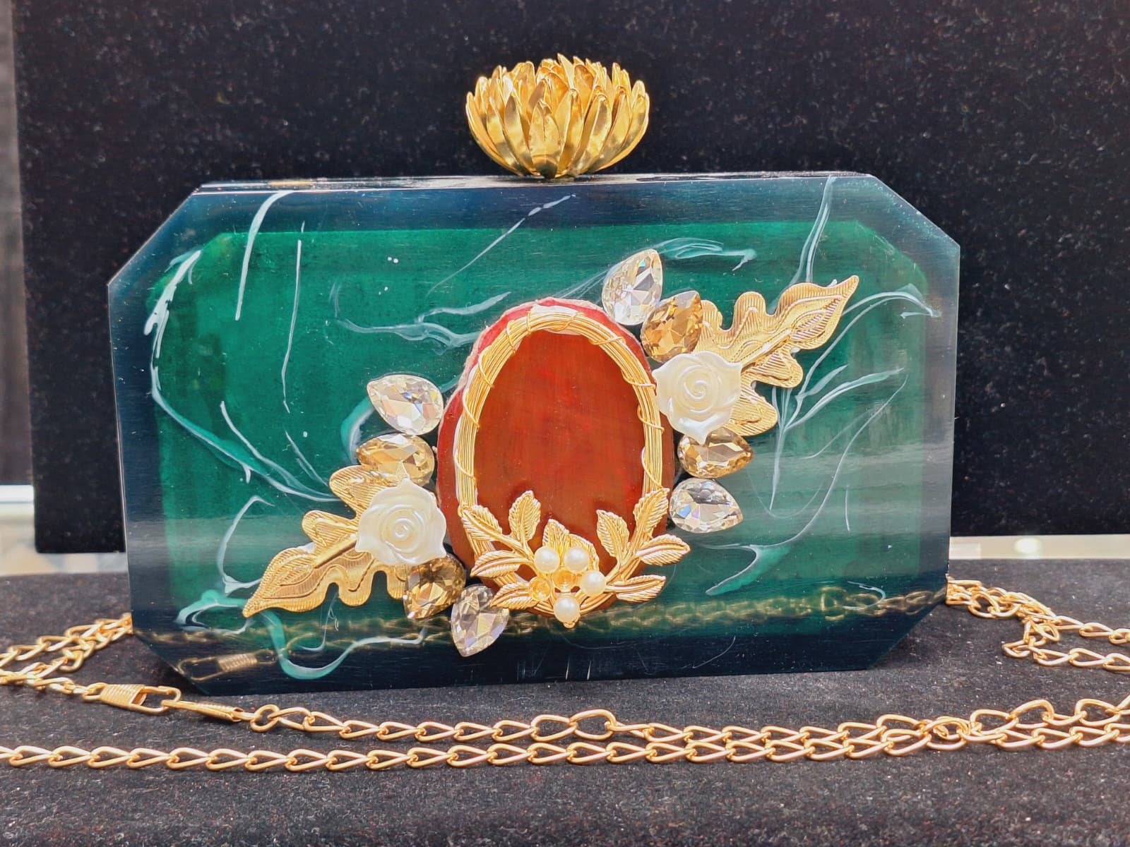#EmeraldElegance #GoldenBloom #LuxuryClutch #EveningGlam #RegalStyle #StatementAccessory #JewelClutch #OpulentCharm