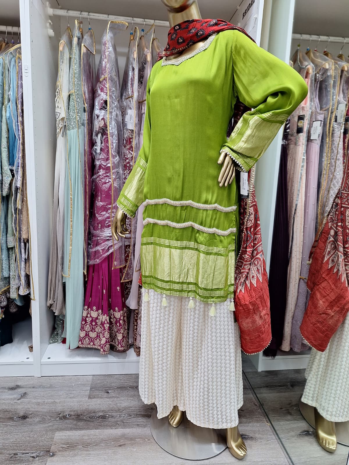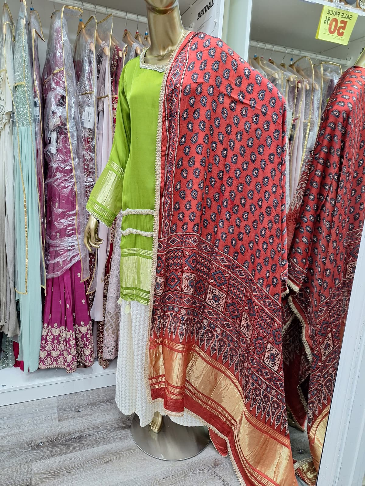 A refreshing blend of lime green and deep rust, this outfit exudes rustic charm with a hint of royalty. The Ajrakh-style printed dupatta and subtle mirror detailing add the perfect ethnic finish. Ideal for casual festive wear or intimate gatherings.