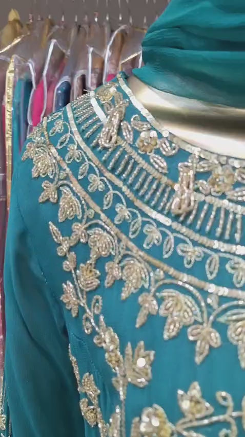 A statement in teal and gold—because you deserve to dazzle! Gold embroidery, graceful flair, and regal vibes—perfect for every festive moment.