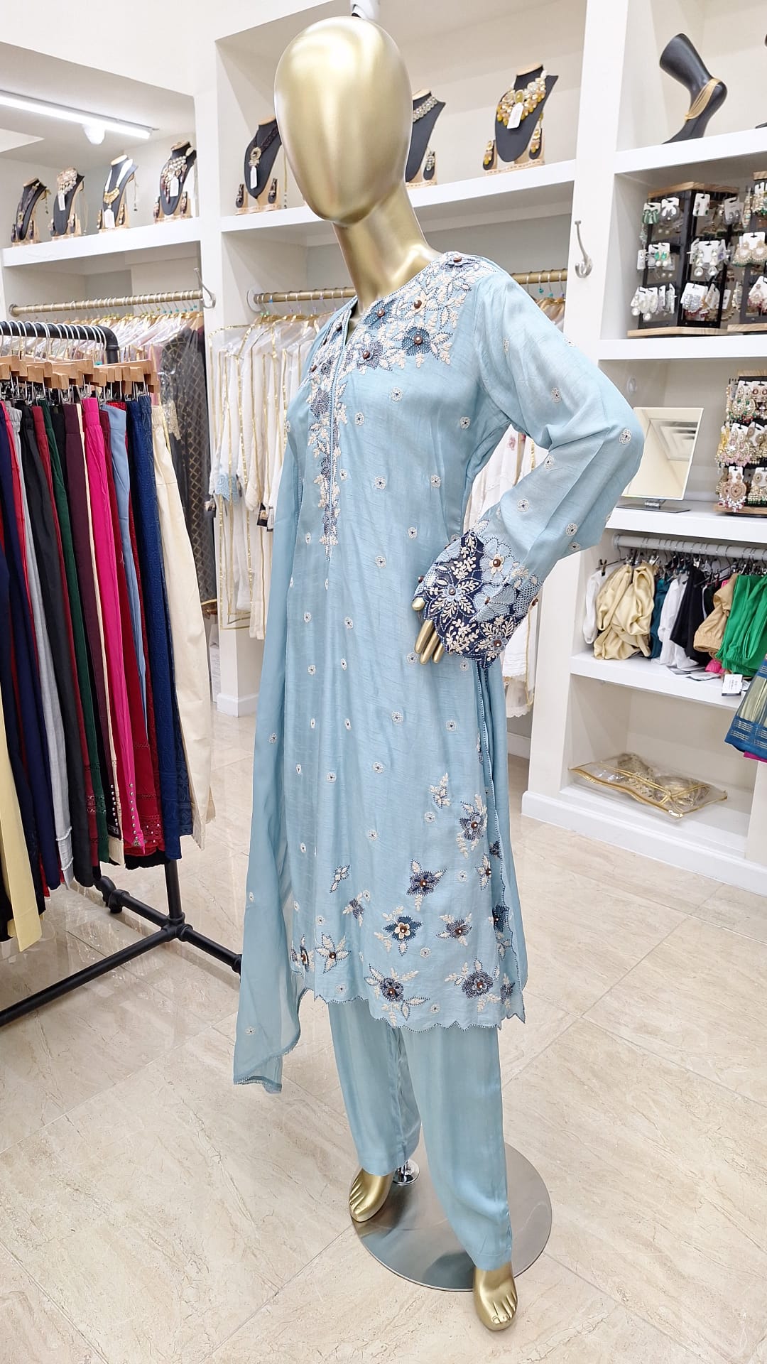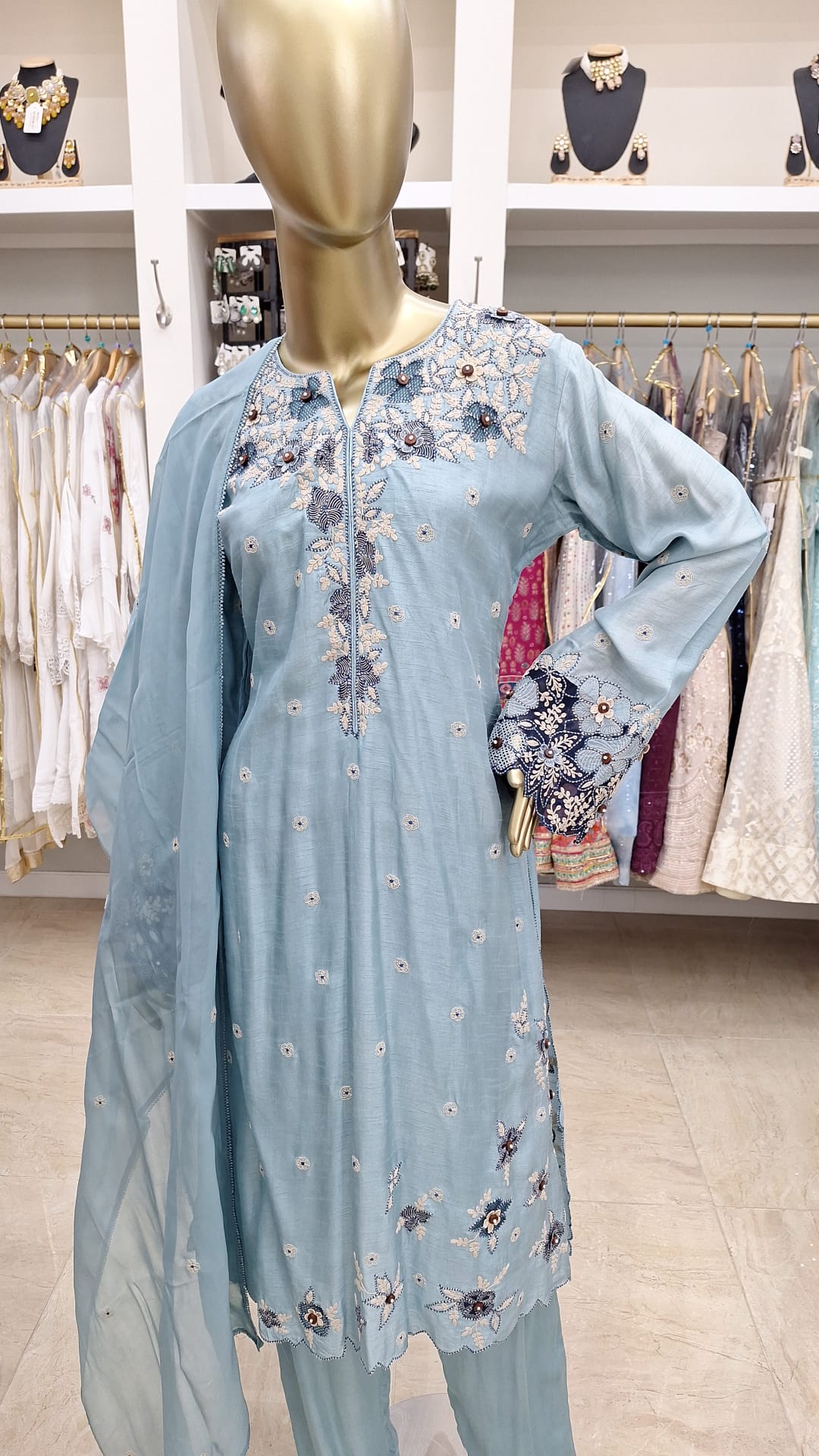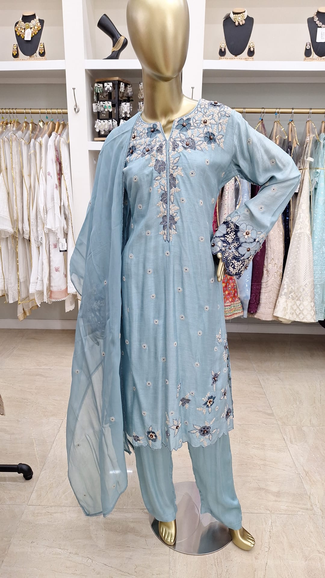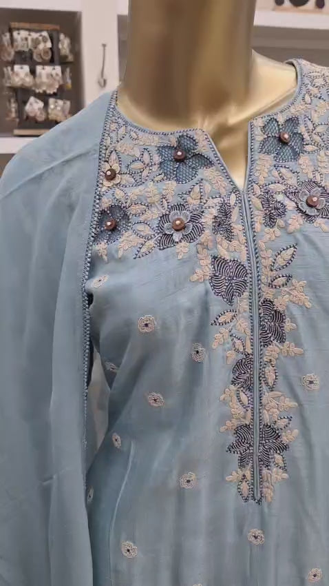 Calm, cool, and effortlessly elegant. Add a breath of freshness to your wardrobe with this delicately embroidered blue ensemble. This powder blue beauty blends subtlety with sophistication.