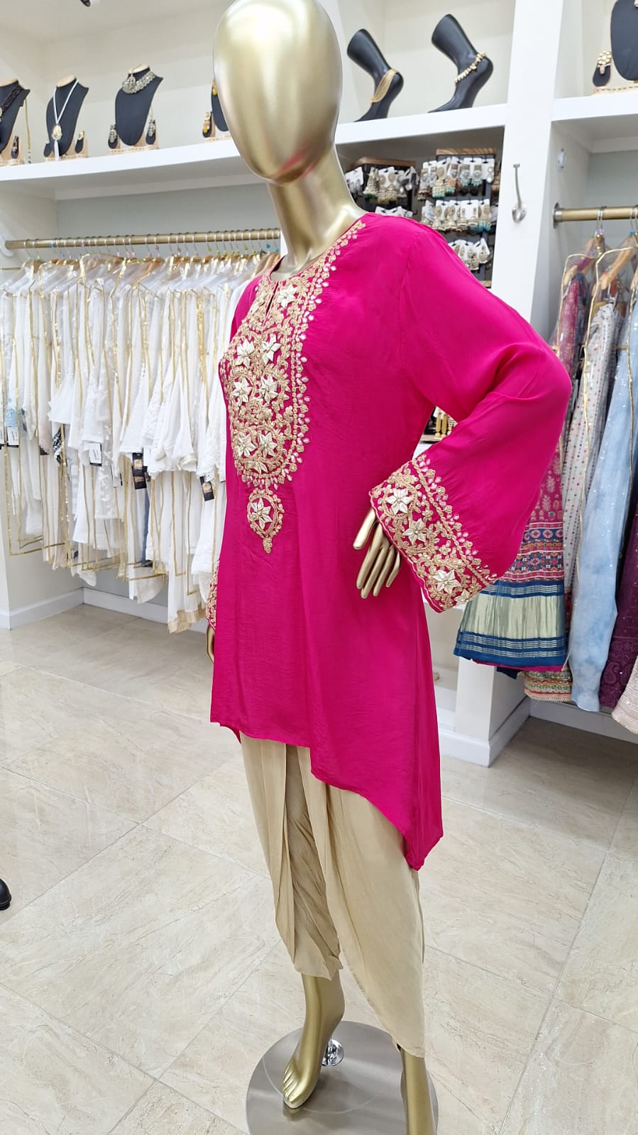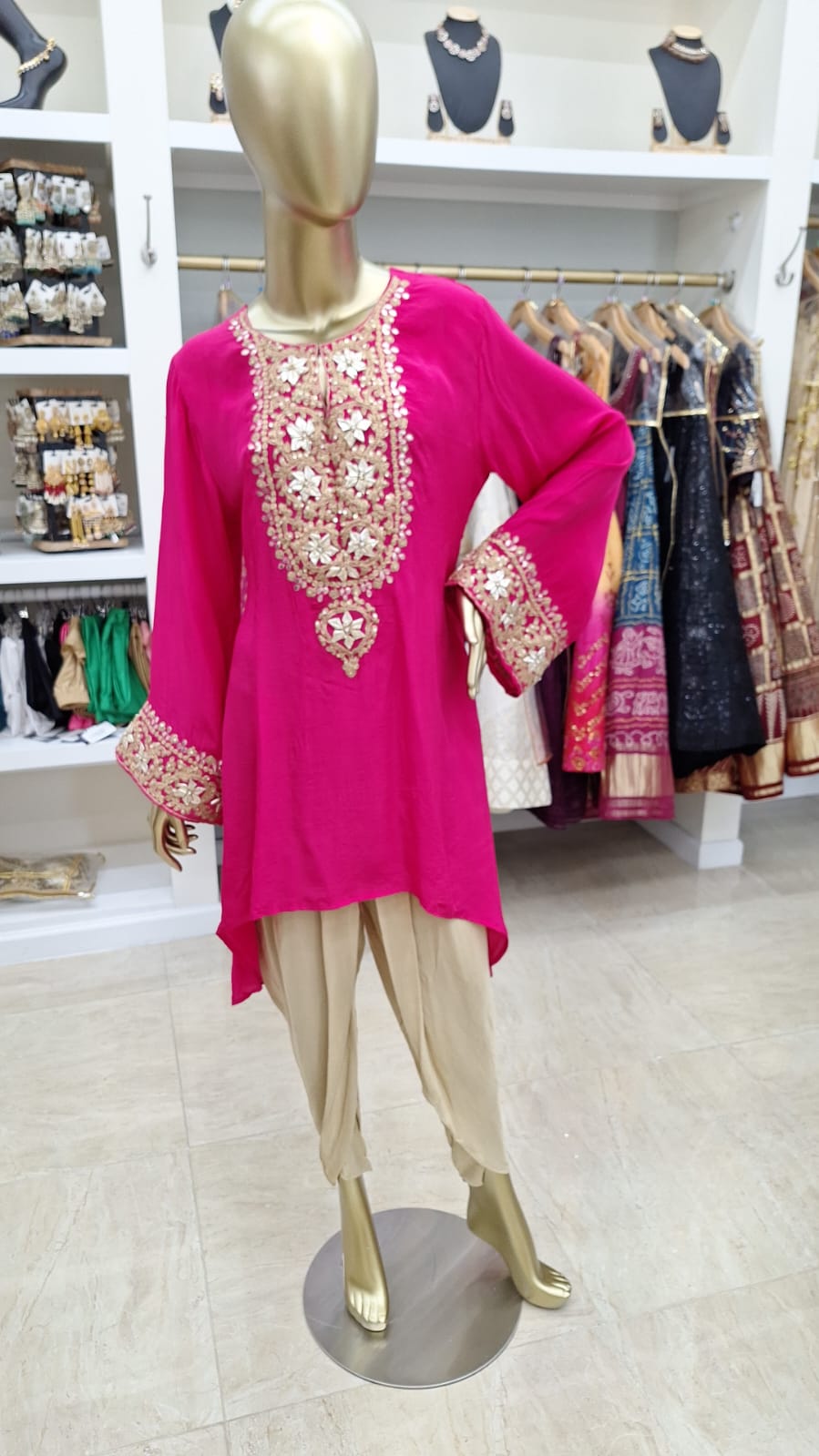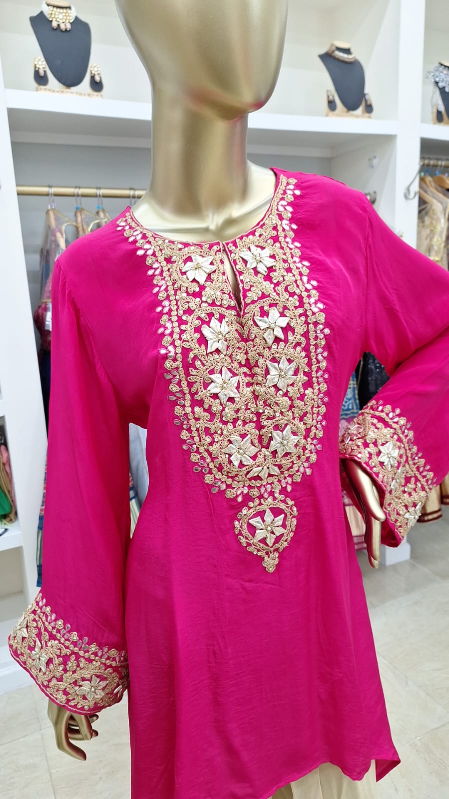 Make a statement in this vibrant fuchsia kurti featuring bold mirror work and intricate hand embroidery. Paired with neutral tulip pants for that perfect festive flair — effortless, elegant, and unapologetically desi!