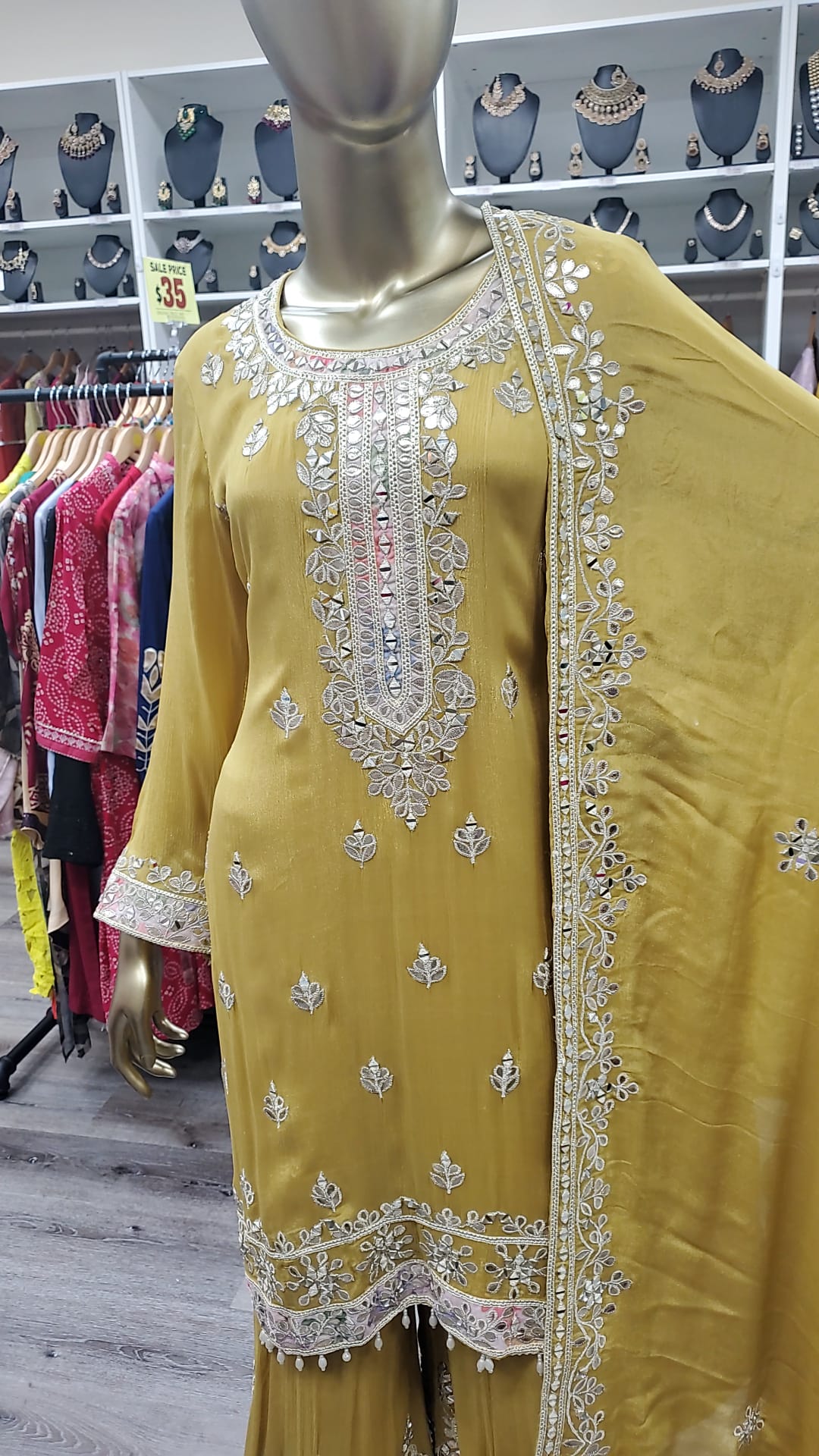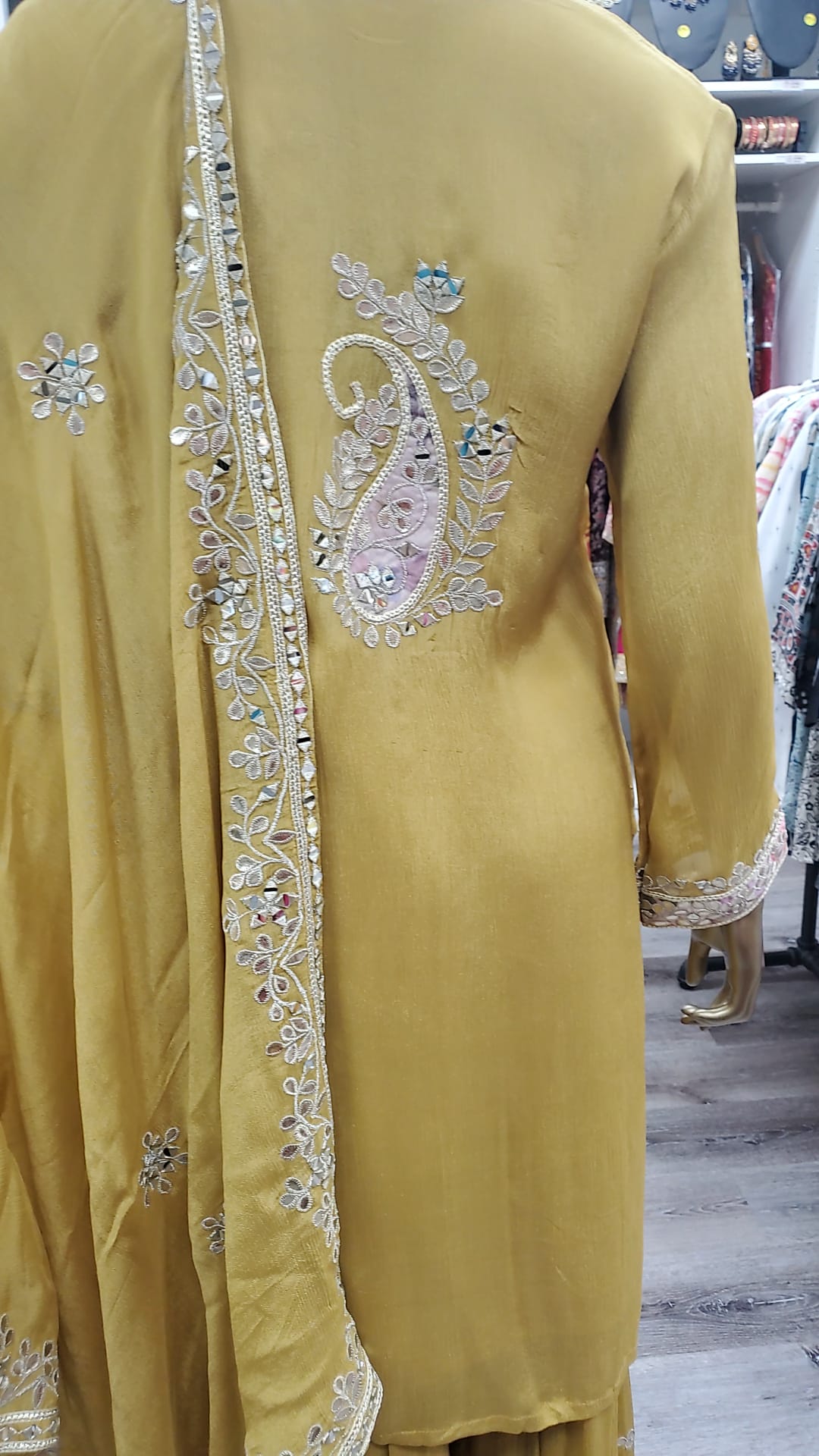 Step into elegance with this mustard-gold sharara suit, adorned with intricate thread and mirror embroidery. A perfect fusion of tradition and trend for your next festive soirée!