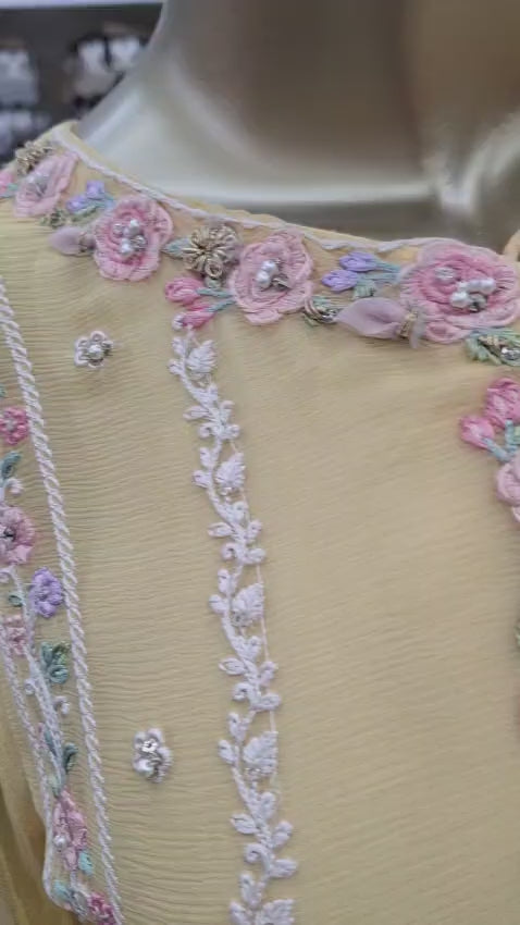 Radiate sunshine and sophistication in this pastel yellow outfit, delicately adorned with pearl accents and floral embroidery. A perfect blend of softness and sparkle for daytime festivities or Eid celebrations.