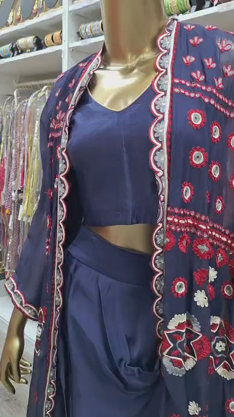 This flowy navy set paired with a sheer, embroidered jacket is your go-to for effortless festive glam.Perfect for pre-wedding events or evening soirées—this outfit is both comfy and captivating.
