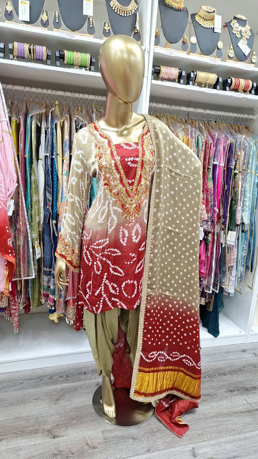 This stunning red and beige bandhani set, adorned with golden embroidery and rich traditional patterns, blends cultural heritage with effortless style. Perfect for festive gatherings and wedding moments, it speaks the language of grace, elegance, and timeless beauty.