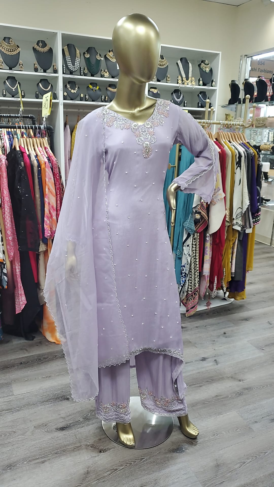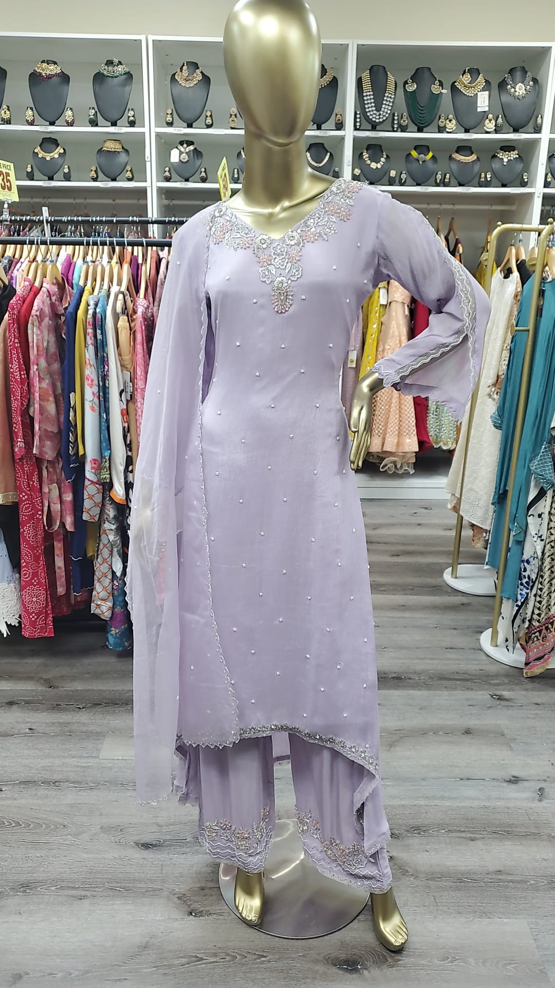 Keep it light, graceful, and dreamy in this lavender sharara suit — delicately embellished with pearls and pastel floral embroidery. An effortless pick for daytime festivities or elegant soirées!