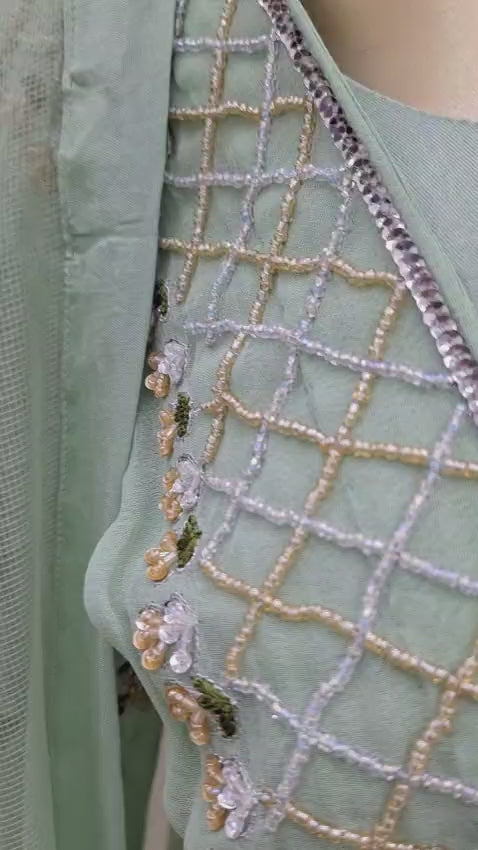 Step into refreshing elegance with this mint green suit, adorned with delicate embroidery and paired with a soft floral-printed dupatta. Light, graceful, and perfect for daytime festivities or Eid brunches.