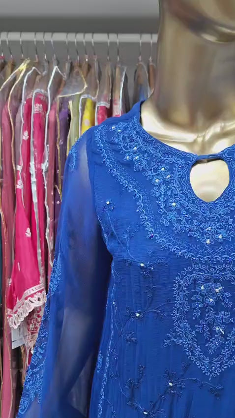 Dive into elegance with this royal blue ensemble, paired with an ocean-inspired dupatta. From deep blues to aqua greens — this outfit brings the beauty of the sea to your wardrobe.