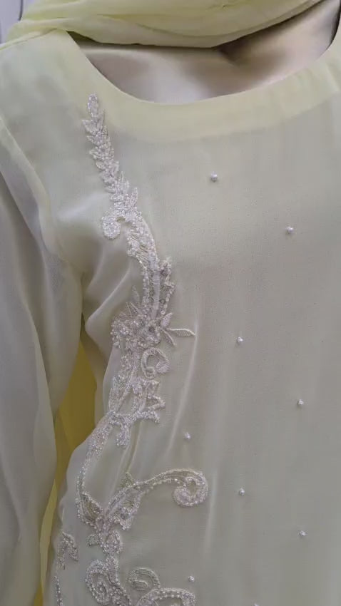 Delicate pearls. Subtle embroidery. Pure sophistication in pastel yellow. he perfect outfit for sunshine-filled days and graceful evenings.
