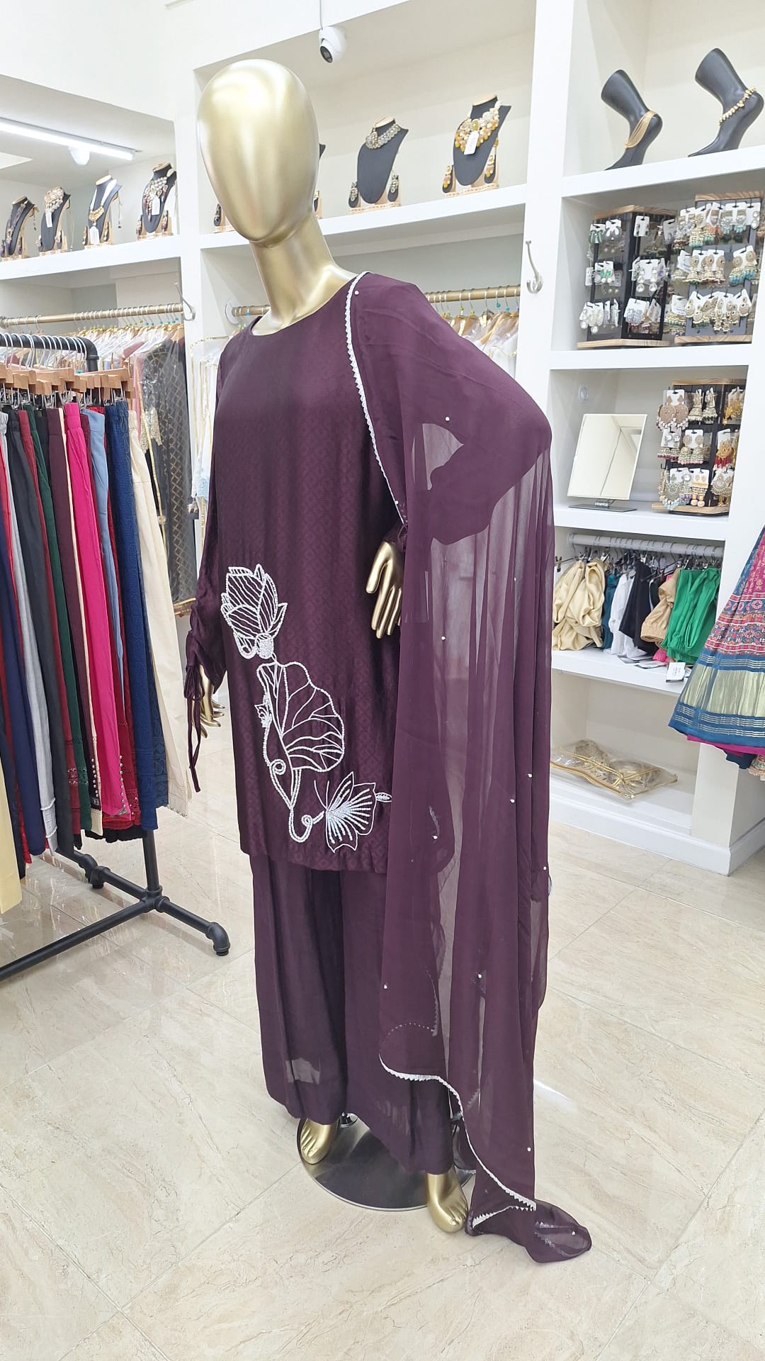 This deep plum ensemble is the perfect blend of sophistication and charm. The bold shade is elevated with delicate white floral embroidery, creating a striking contrast that feels both timeless and modern. Paired with a sheer dupatta for that subtle, flowy touch — this look is effortlessly chic for any festive or evening occasion.