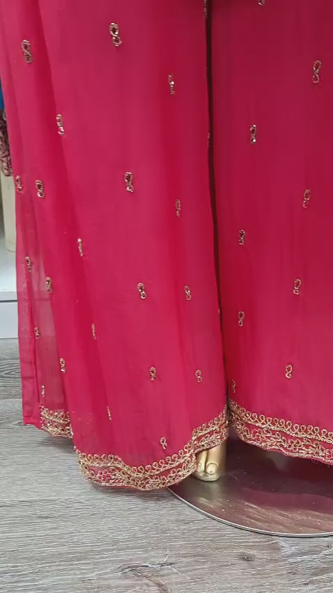 Turn heads in this stunning Rani pink embroidered kurta set, perfectly paired with a flared sharara and sheer dupatta. Rich golden threadwork adds the royal touch you’ve been waiting for. Perfect for festive soirées or wedding celebrations!