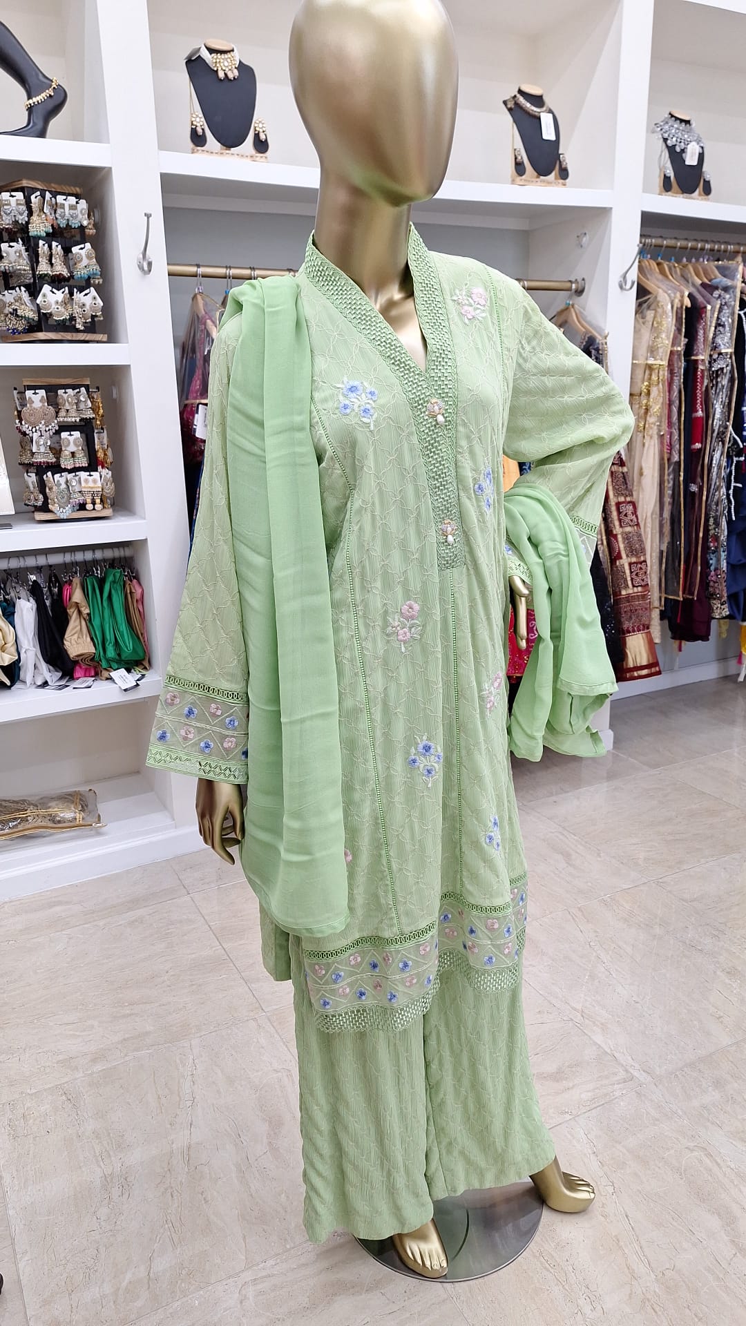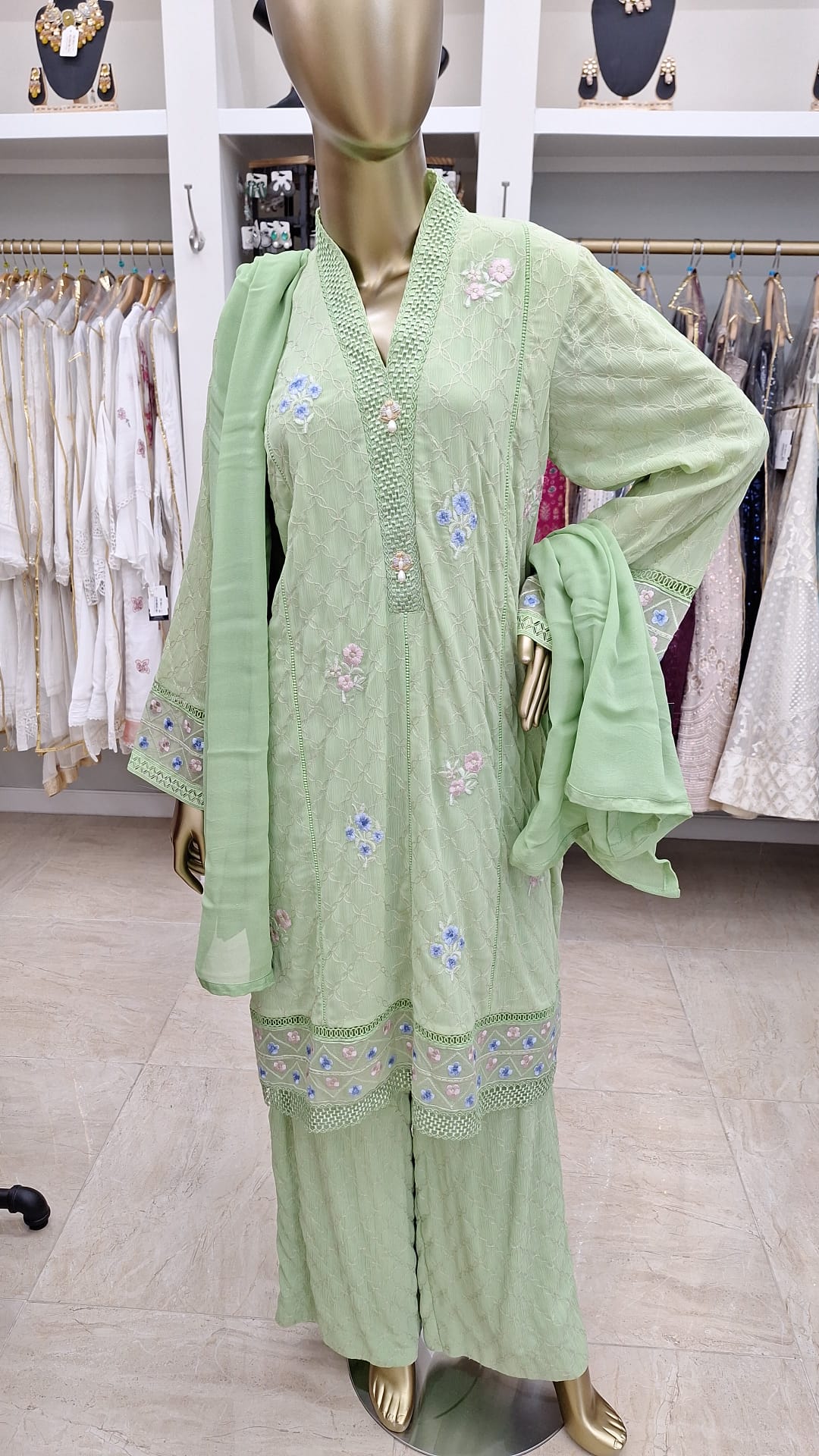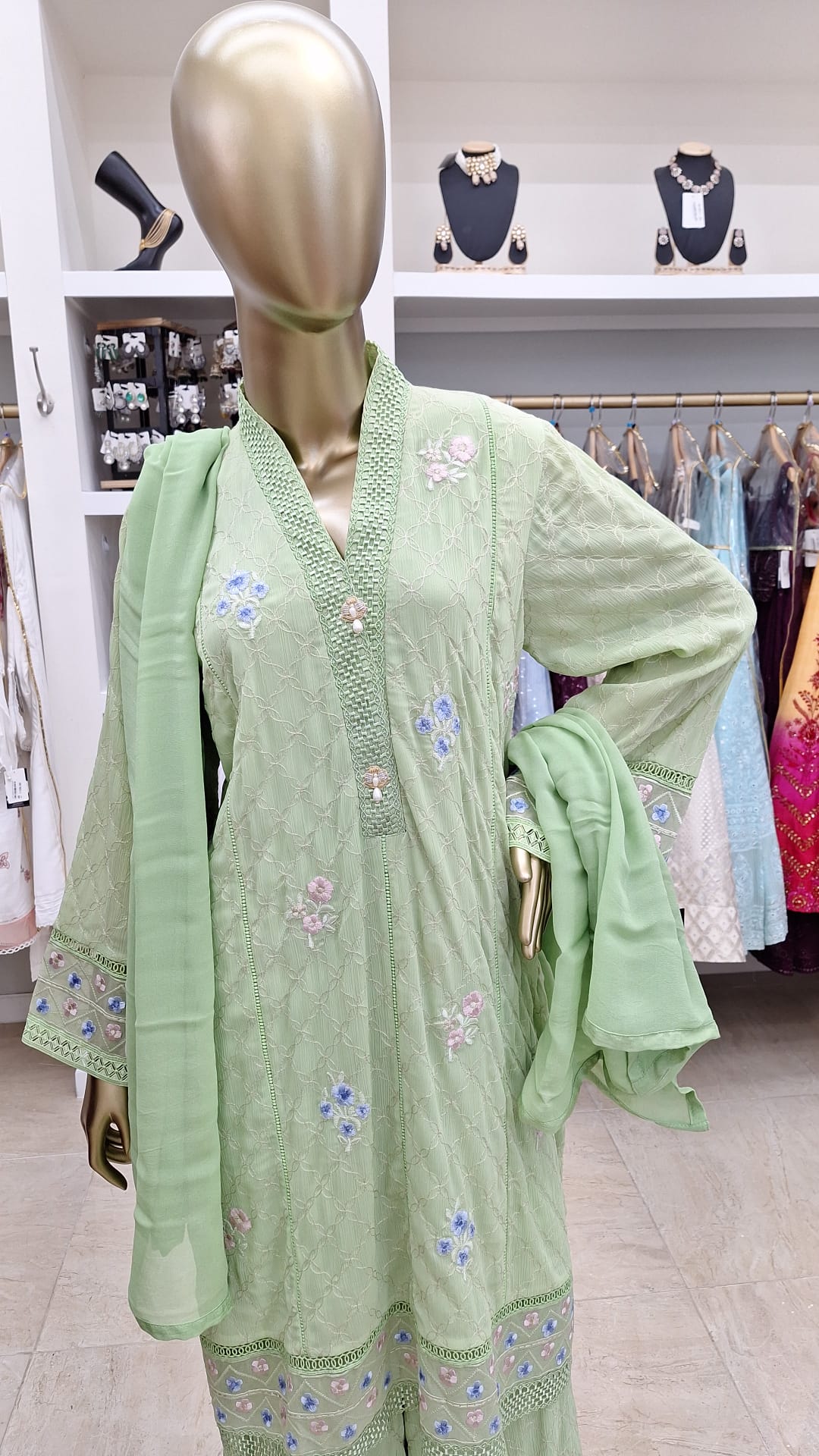 Soothing tones, intricate details.Pastel green with hints of pink and blue florals—understated and unforgettable. This soft green suit is a breath of calm and charm.