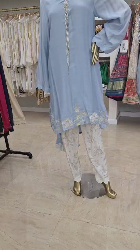 Float into elegance with this dreamy sky-blue kurta set, adorned with delicate embroidery and pearl accents.