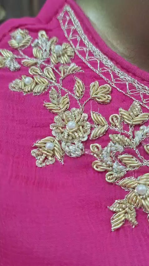 This hot pink ensemble with golden embroidery is a celebration of confidence, elegance, and festive charm. Perfect for turning heads at any occasion.