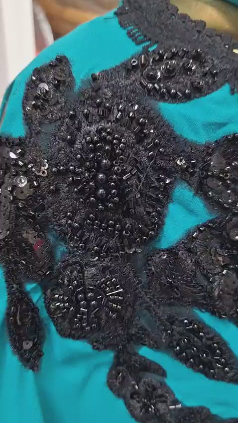 Bold, breezy, and beautifully different! This teal asymmetrical ensemble with black sequin detailing is your go-to for cocktail nights, festive dinners, or when you want all eyes on you.