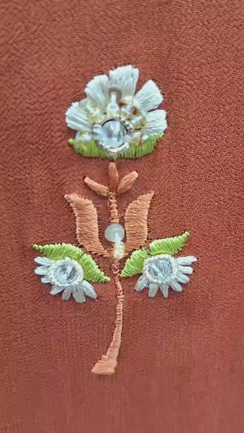 A warm, earthy hue paired with intricate detailing makes this outfit ideal for both daytime chic and evening grace.