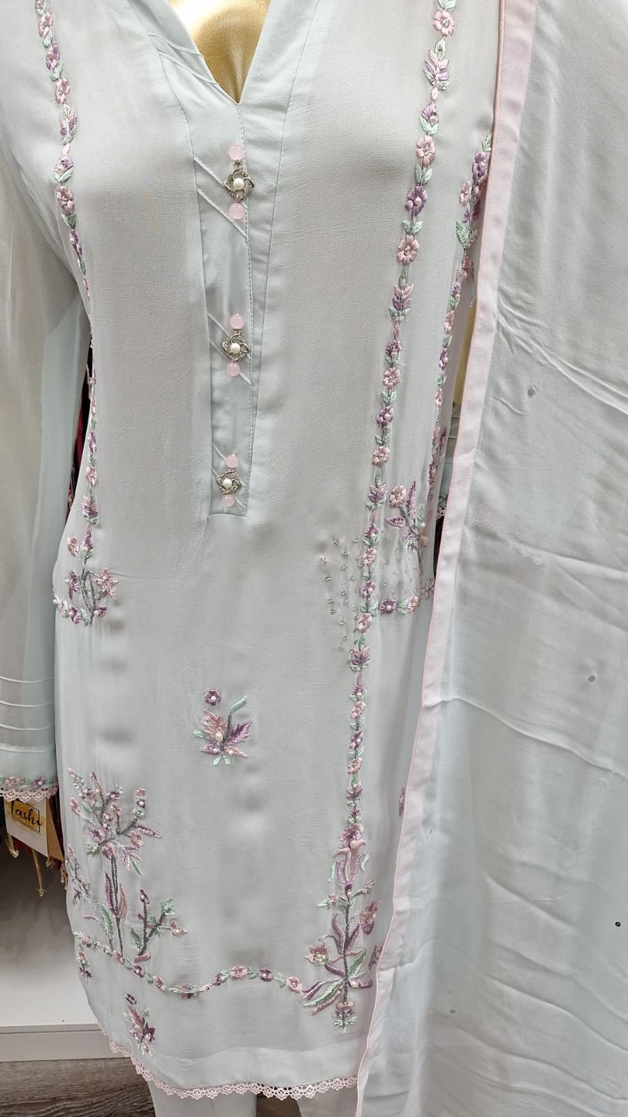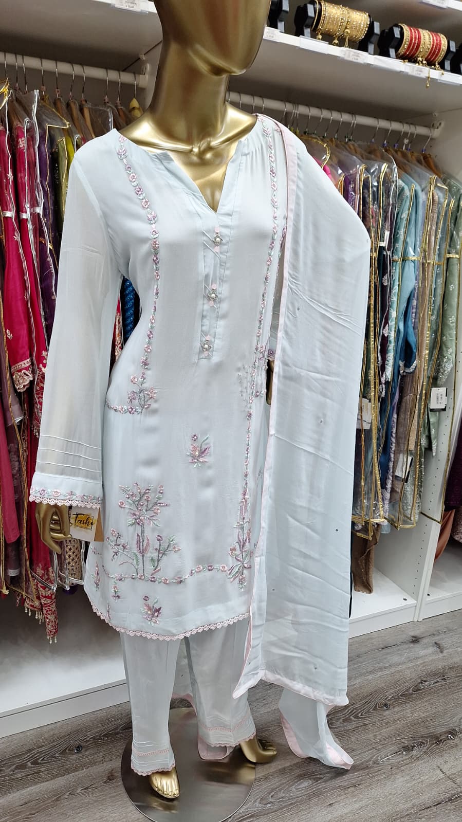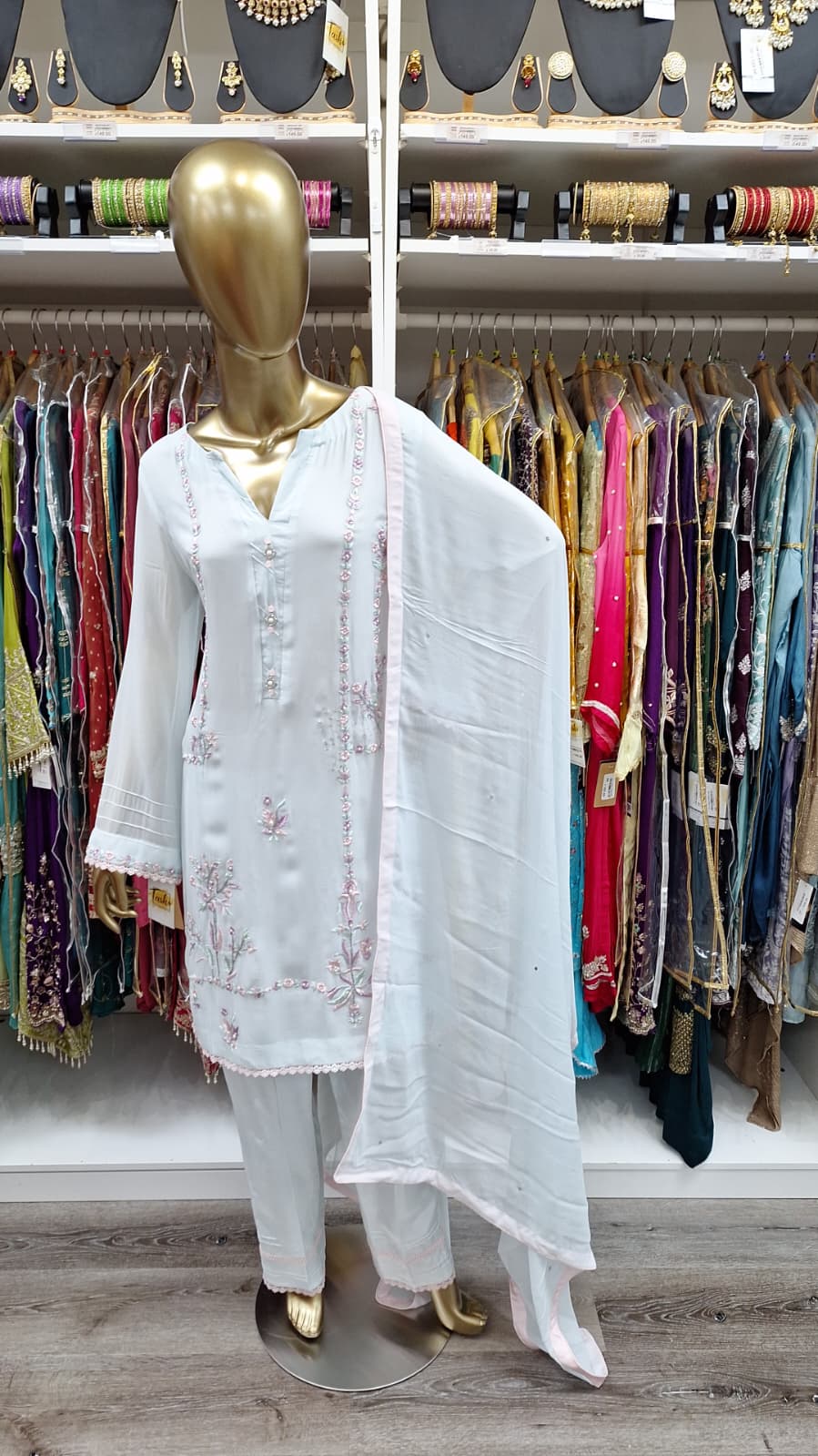 This white outfit with pastel pink floral embroidery is the definition of graceful minimalism. The soft detailing, paired with a sheer dupatta, creates a look that is timeless and effortlessly chic.