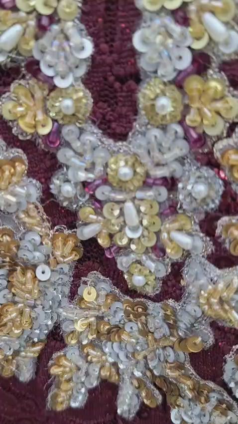 Deep wine tones meet intricate lace and golden detailing in this regal ensemble — perfect for mehendis, receptions, or festive nights that call for quiet luxury. Style that speaks without shouting.